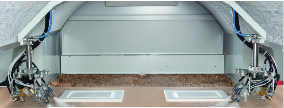 MITO can be equipped with 1 central or 2 side arms. The arms are able to manage colour/product change automatically and fast. Valve and time control can be handled directly by the software. MITO is also suitable for glass. The MITO Glass configuration is absolutely the most flexible system for spraying on glass, since it is able to apply any type of paint. It is equipped with 1 special arm, which allows very fast automatic colour change, perfect for small production batches.